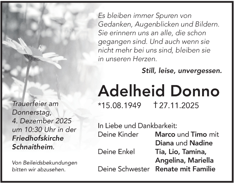 Hier finden Sie alle Traueranzeigen aus der Zeitung, die bisher für Adelheid Donno erschienen sind. Weitere Traueranzeigen, die in der Zeitung erscheinen, werden hier ebenfalls aufgelistet