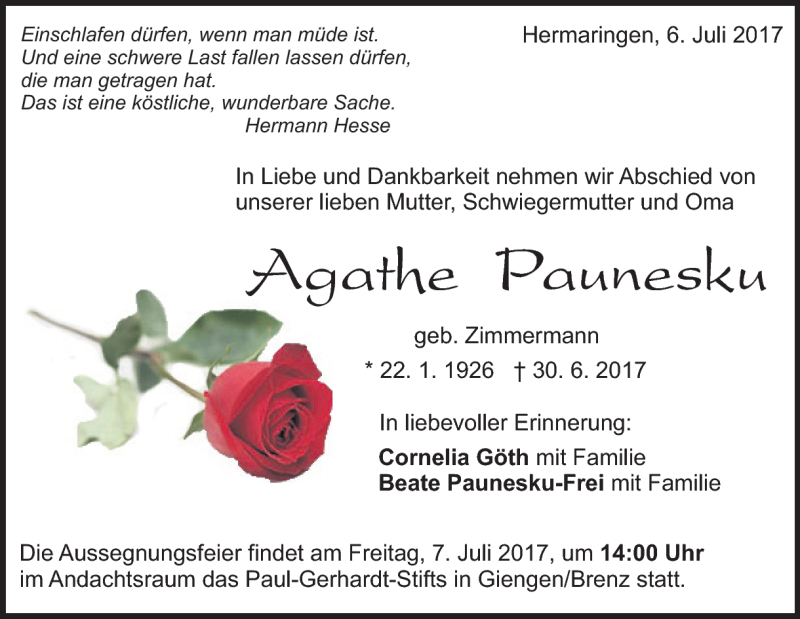 Hier finden Sie alle Traueranzeigen aus der Zeitung, die bisher für Agathe Paunesku erschienen sind. Weitere Traueranzeigen, die in der Zeitung erscheinen, werden hier ebenfalls aufgelistet