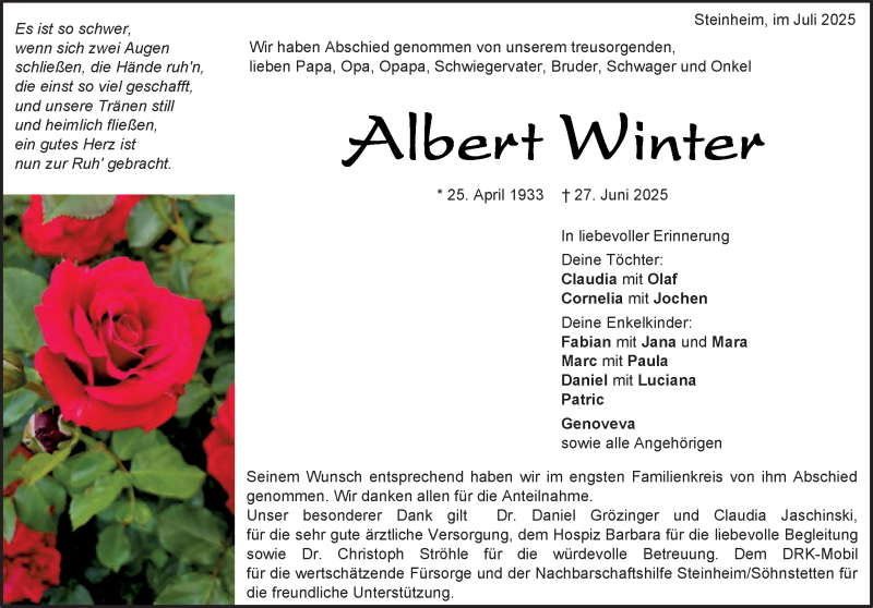 Hier finden Sie alle Traueranzeigen aus der Zeitung, die bisher für Albert WInter erschienen sind. Weitere Traueranzeigen, die in der Zeitung erscheinen, werden hier ebenfalls aufgelistet