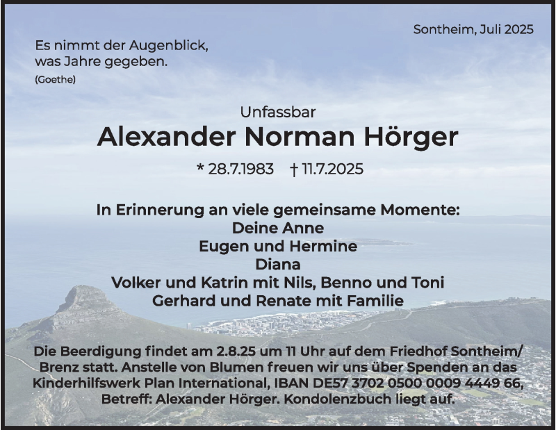 Hier finden Sie alle Traueranzeigen aus der Zeitung, die bisher für Alexander Norman Hörger erschienen sind. Weitere Traueranzeigen, die in der Zeitung erscheinen, werden hier ebenfalls aufgelistet