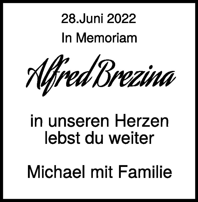 Hier finden Sie alle Traueranzeigen aus der Zeitung, die bisher für Alfred Brezina erschienen sind. Weitere Traueranzeigen, die in der Zeitung erscheinen, werden hier ebenfalls aufgelistet