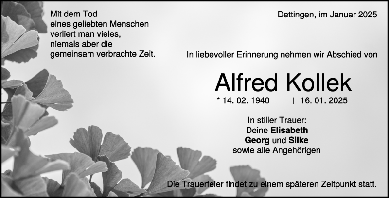 Hier finden Sie alle Traueranzeigen aus der Zeitung, die bisher für Alfred Kollek erschienen sind. Weitere Traueranzeigen, die in der Zeitung erscheinen, werden hier ebenfalls aufgelistet