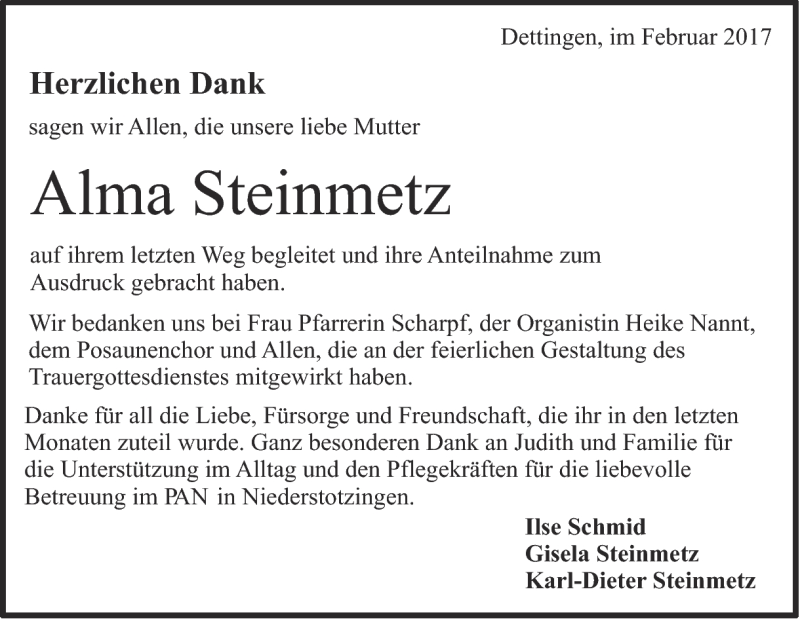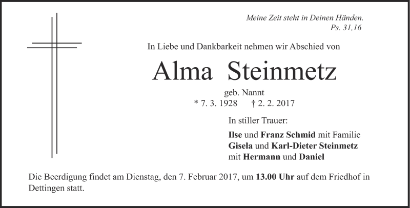 Hier finden Sie alle Traueranzeigen aus der Zeitung, die bisher für Alma Steinmetz erschienen sind. Weitere Traueranzeigen, die in der Zeitung erscheinen, werden hier ebenfalls aufgelistet