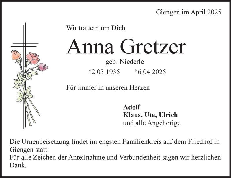 Hier finden Sie alle Traueranzeigen aus der Zeitung, die bisher für Anna Gretzer erschienen sind. Weitere Traueranzeigen, die in der Zeitung erscheinen, werden hier ebenfalls aufgelistet