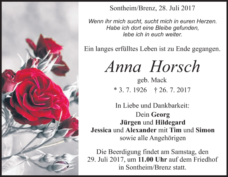 Hier finden Sie alle Traueranzeigen aus der Zeitung, die bisher für Anna Horsch erschienen sind. Weitere Traueranzeigen, die in der Zeitung erscheinen, werden hier ebenfalls aufgelistet