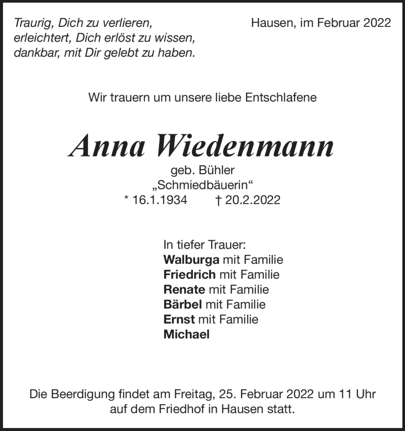 Hier finden Sie alle Traueranzeigen aus der Zeitung, die bisher für Anna Wiedenmann erschienen sind. Weitere Traueranzeigen, die in der Zeitung erscheinen, werden hier ebenfalls aufgelistet