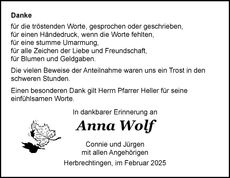 Hier finden Sie alle Traueranzeigen aus der Zeitung, die bisher für Anna Wolf erschienen sind. Weitere Traueranzeigen, die in der Zeitung erscheinen, werden hier ebenfalls aufgelistet