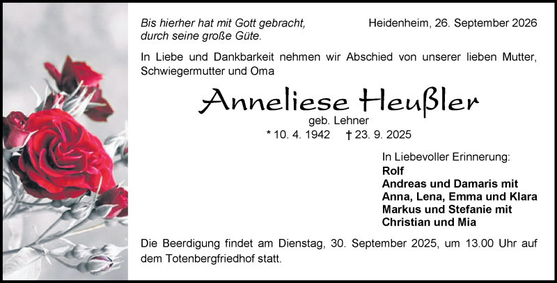 Hier finden Sie alle Traueranzeigen aus der Zeitung, die bisher für Anneliese Heußler erschienen sind. Weitere Traueranzeigen, die in der Zeitung erscheinen, werden hier ebenfalls aufgelistet