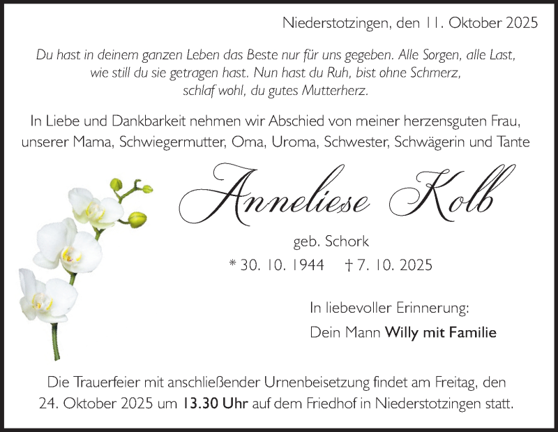 Hier finden Sie alle Traueranzeigen aus der Zeitung, die bisher für Anneliese Kolb erschienen sind. Weitere Traueranzeigen, die in der Zeitung erscheinen, werden hier ebenfalls aufgelistet
