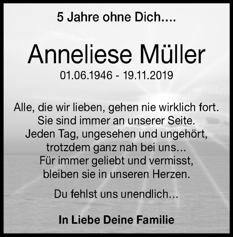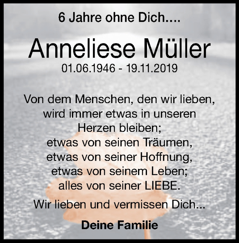 Hier finden Sie alle Traueranzeigen aus der Zeitung, die bisher für Anneliese Müller erschienen sind. Weitere Traueranzeigen, die in der Zeitung erscheinen, werden hier ebenfalls aufgelistet