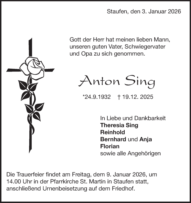 Hier finden Sie alle Traueranzeigen aus der Zeitung, die bisher für Anton Sing erschienen sind. Weitere Traueranzeigen, die in der Zeitung erscheinen, werden hier ebenfalls aufgelistet