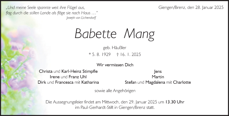 Hier finden Sie alle Traueranzeigen aus der Zeitung, die bisher für Babette Mang erschienen sind. Weitere Traueranzeigen, die in der Zeitung erscheinen, werden hier ebenfalls aufgelistet