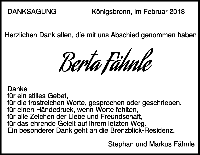 Hier finden Sie alle Traueranzeigen aus der Zeitung, die bisher für Berta Fähnle erschienen sind. Weitere Traueranzeigen, die in der Zeitung erscheinen, werden hier ebenfalls aufgelistet