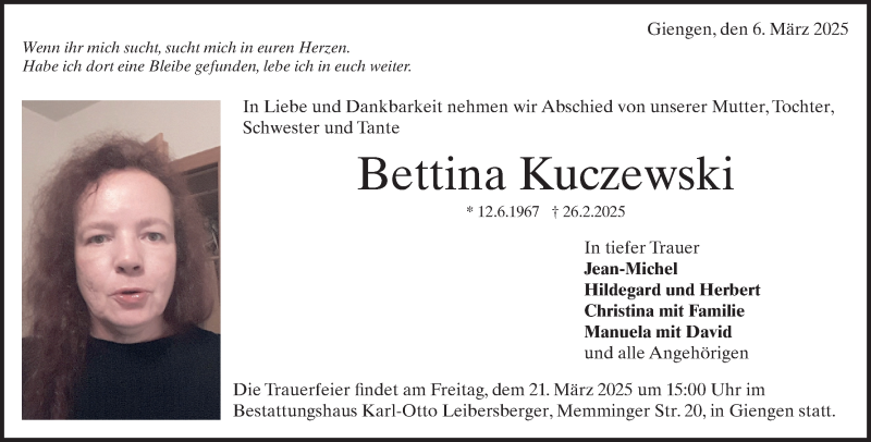 Hier finden Sie alle Traueranzeigen aus der Zeitung, die bisher für Bettina Kuczewski erschienen sind. Weitere Traueranzeigen, die in der Zeitung erscheinen, werden hier ebenfalls aufgelistet