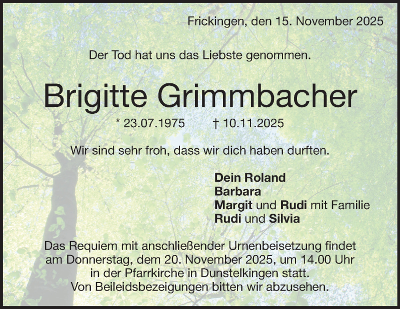 Hier finden Sie alle Traueranzeigen aus der Zeitung, die bisher für Brigitte Grimmbacher erschienen sind. Weitere Traueranzeigen, die in der Zeitung erscheinen, werden hier ebenfalls aufgelistet