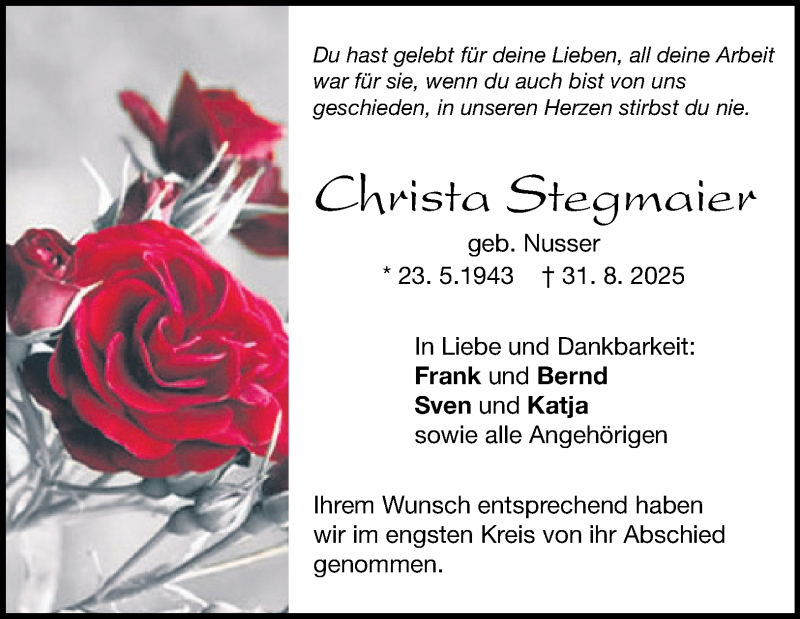 Hier finden Sie alle Traueranzeigen aus der Zeitung, die bisher für Christa Stegmaier erschienen sind. Weitere Traueranzeigen, die in der Zeitung erscheinen, werden hier ebenfalls aufgelistet