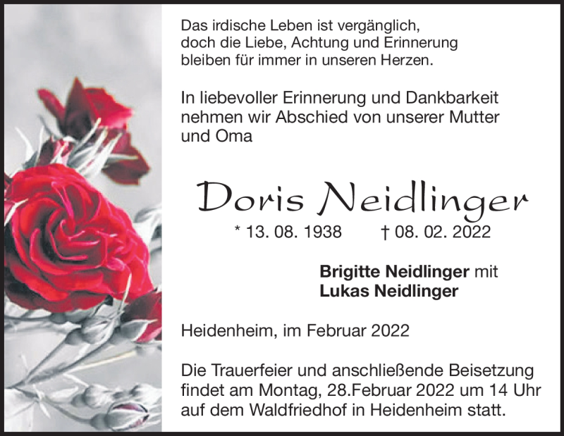 Hier finden Sie alle Traueranzeigen aus der Zeitung, die bisher für Doris Neidlinger erschienen sind. Weitere Traueranzeigen, die in der Zeitung erscheinen, werden hier ebenfalls aufgelistet
