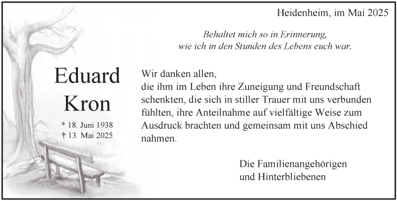 Hier finden Sie alle Traueranzeigen aus der Zeitung, die bisher für Eduard Kron erschienen sind. Weitere Traueranzeigen, die in der Zeitung erscheinen, werden hier ebenfalls aufgelistet