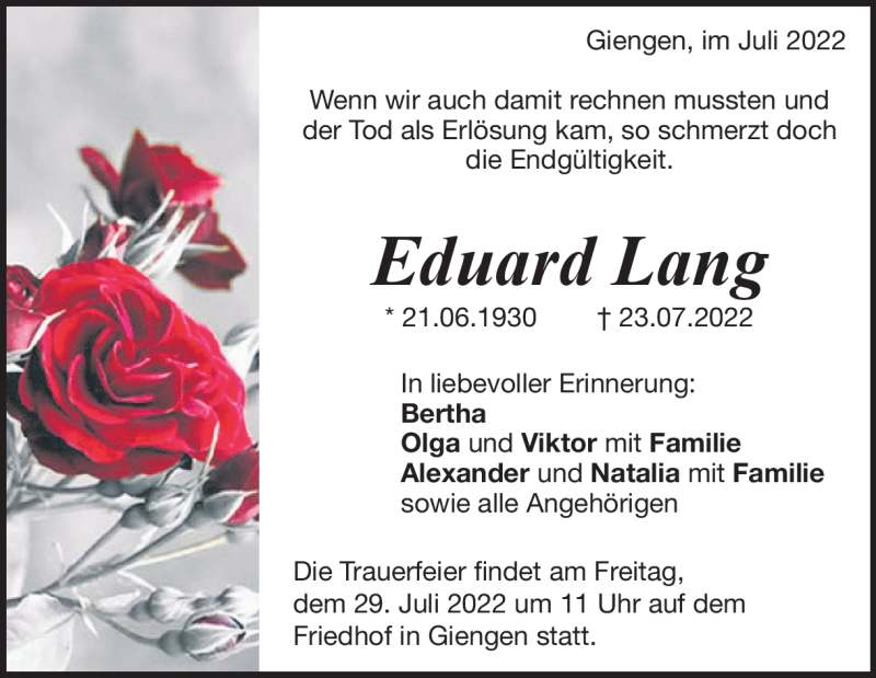 Hier finden Sie alle Traueranzeigen aus der Zeitung, die bisher für Eduard Lang erschienen sind. Weitere Traueranzeigen, die in der Zeitung erscheinen, werden hier ebenfalls aufgelistet