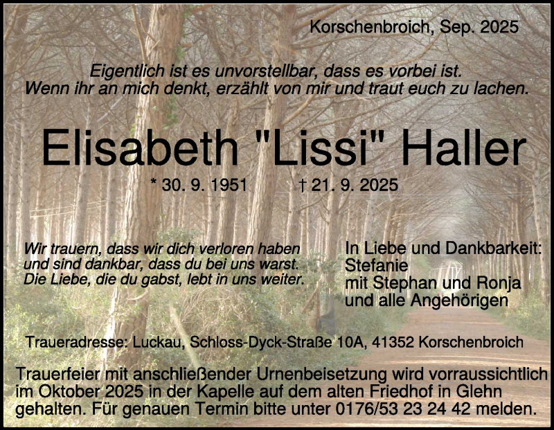 Hier finden Sie alle Traueranzeigen aus der Zeitung, die bisher für Elisabeth Haller erschienen sind. Weitere Traueranzeigen, die in der Zeitung erscheinen, werden hier ebenfalls aufgelistet