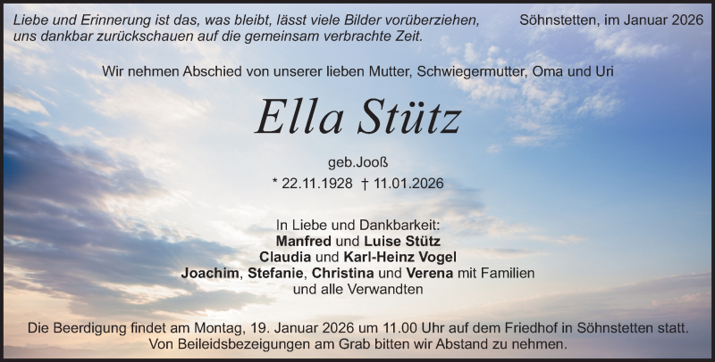 Hier finden Sie alle Traueranzeigen aus der Zeitung, die bisher für Ella Stütz erschienen sind. Weitere Traueranzeigen, die in der Zeitung erscheinen, werden hier ebenfalls aufgelistet