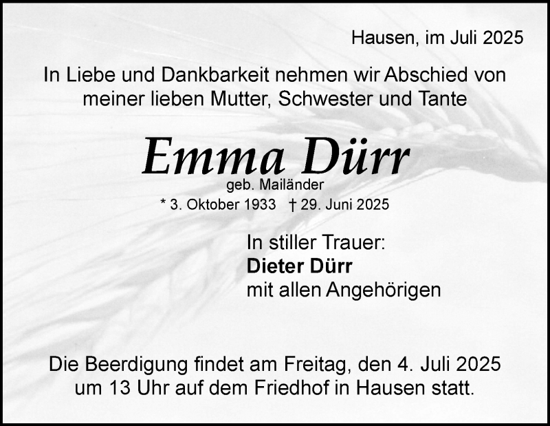 Hier finden Sie alle Traueranzeigen aus der Zeitung, die bisher für Emaa Dürr erschienen sind. Weitere Traueranzeigen, die in der Zeitung erscheinen, werden hier ebenfalls aufgelistet