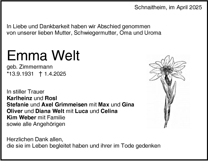 Hier finden Sie alle Traueranzeigen aus der Zeitung, die bisher für Emma Welt erschienen sind. Weitere Traueranzeigen, die in der Zeitung erscheinen, werden hier ebenfalls aufgelistet