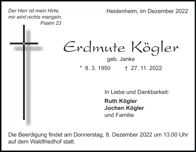 Hier finden Sie alle Traueranzeigen aus der Zeitung, die bisher für Erdmute Kögler erschienen sind. Weitere Traueranzeigen, die in der Zeitung erscheinen, werden hier ebenfalls aufgelistet