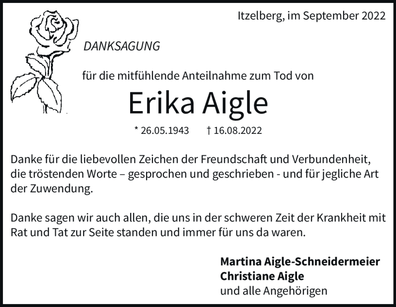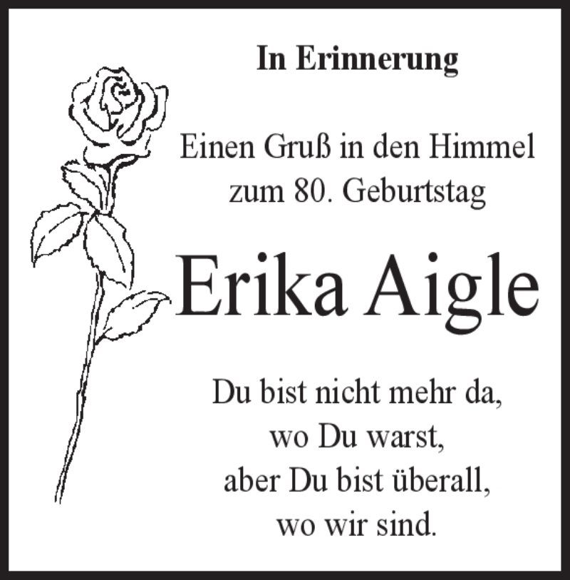 Hier finden Sie alle Traueranzeigen aus der Zeitung, die bisher für Erika Aigle erschienen sind. Weitere Traueranzeigen, die in der Zeitung erscheinen, werden hier ebenfalls aufgelistet