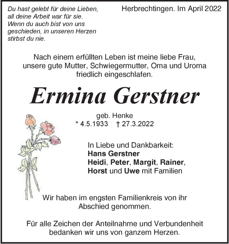 Hier finden Sie alle Traueranzeigen aus der Zeitung, die bisher für Ermina Gerstner erschienen sind. Weitere Traueranzeigen, die in der Zeitung erscheinen, werden hier ebenfalls aufgelistet