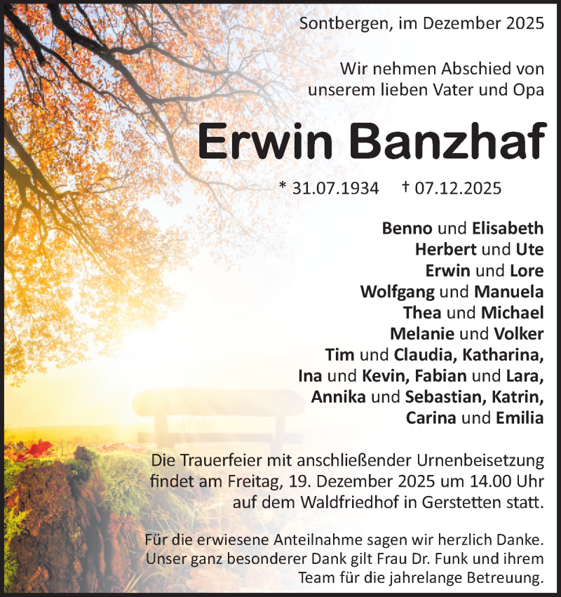 Hier finden Sie alle Traueranzeigen aus der Zeitung, die bisher für Erwin Banzhaf erschienen sind. Weitere Traueranzeigen, die in der Zeitung erscheinen, werden hier ebenfalls aufgelistet