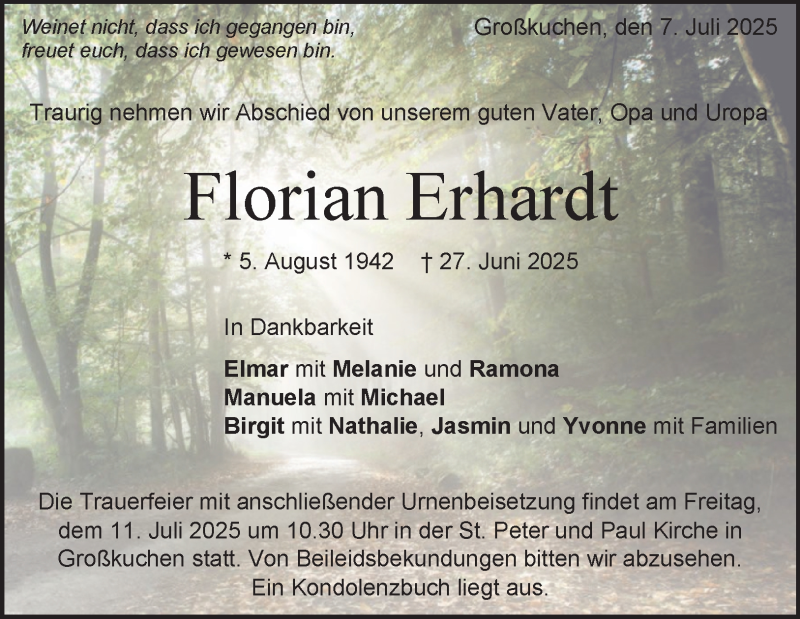 Hier finden Sie alle Traueranzeigen aus der Zeitung, die bisher für Florian Erhardt erschienen sind. Weitere Traueranzeigen, die in der Zeitung erscheinen, werden hier ebenfalls aufgelistet