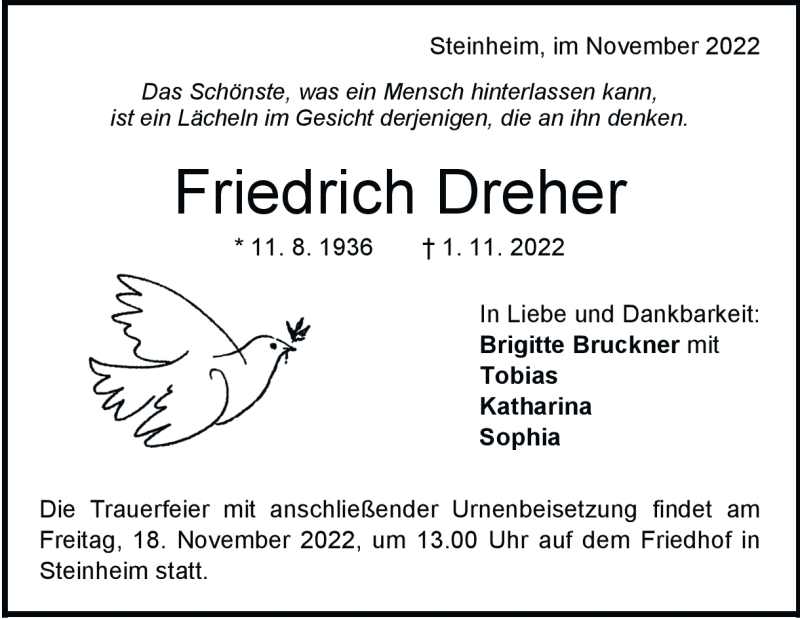 Hier finden Sie alle Traueranzeigen aus der Zeitung, die bisher für Friedrich Dreher erschienen sind. Weitere Traueranzeigen, die in der Zeitung erscheinen, werden hier ebenfalls aufgelistet