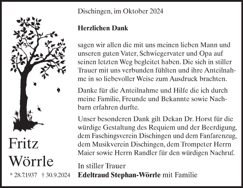 Hier finden Sie alle Traueranzeigen aus der Zeitung, die bisher für Fritz Wörrle erschienen sind. Weitere Traueranzeigen, die in der Zeitung erscheinen, werden hier ebenfalls aufgelistet