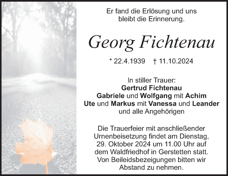 Hier finden Sie alle Traueranzeigen aus der Zeitung, die bisher für Georg Fichtenau erschienen sind. Weitere Traueranzeigen, die in der Zeitung erscheinen, werden hier ebenfalls aufgelistet