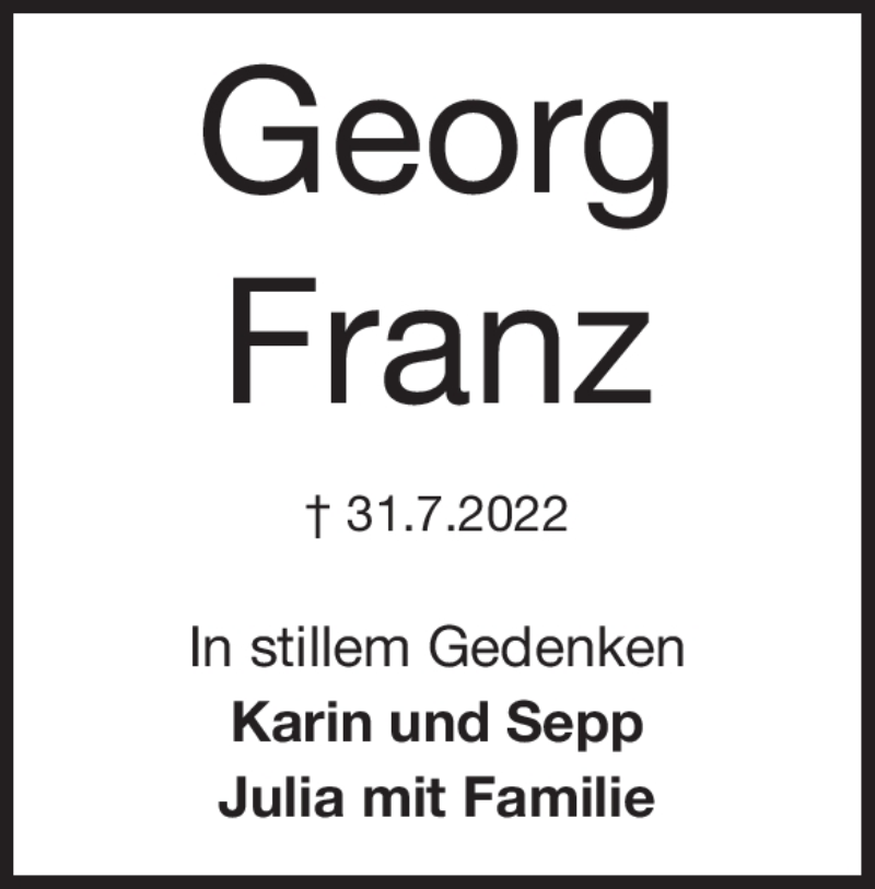Hier finden Sie alle Traueranzeigen aus der Zeitung, die bisher für Georg Franz erschienen sind. Weitere Traueranzeigen, die in der Zeitung erscheinen, werden hier ebenfalls aufgelistet