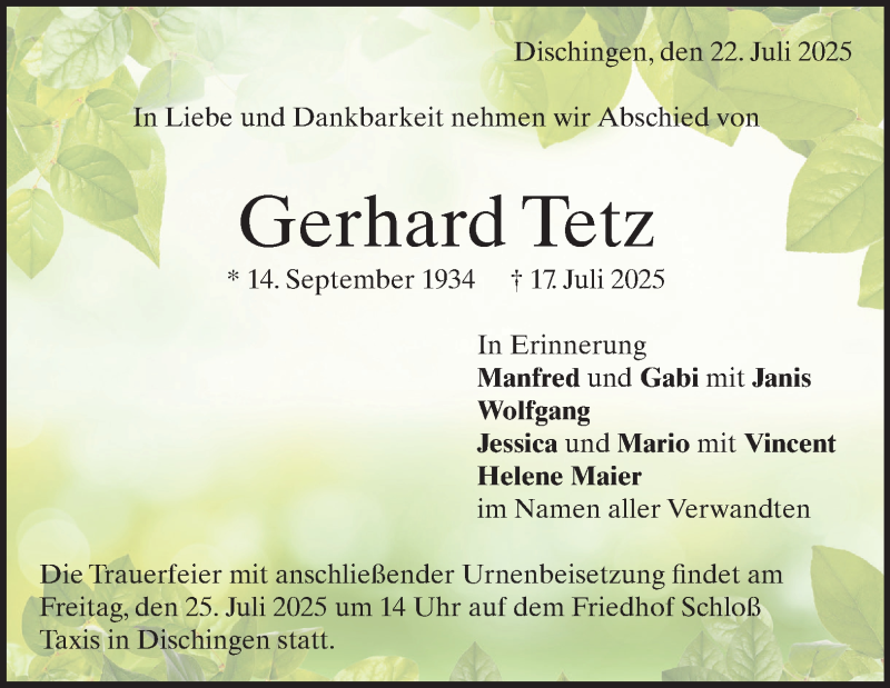Hier finden Sie alle Traueranzeigen aus der Zeitung, die bisher für Gerhard Tetz erschienen sind. Weitere Traueranzeigen, die in der Zeitung erscheinen, werden hier ebenfalls aufgelistet