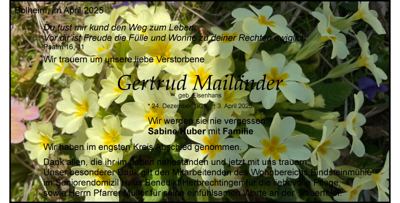 Hier finden Sie alle Traueranzeigen aus der Zeitung, die bisher für Gertrud Mailänder erschienen sind. Weitere Traueranzeigen, die in der Zeitung erscheinen, werden hier ebenfalls aufgelistet