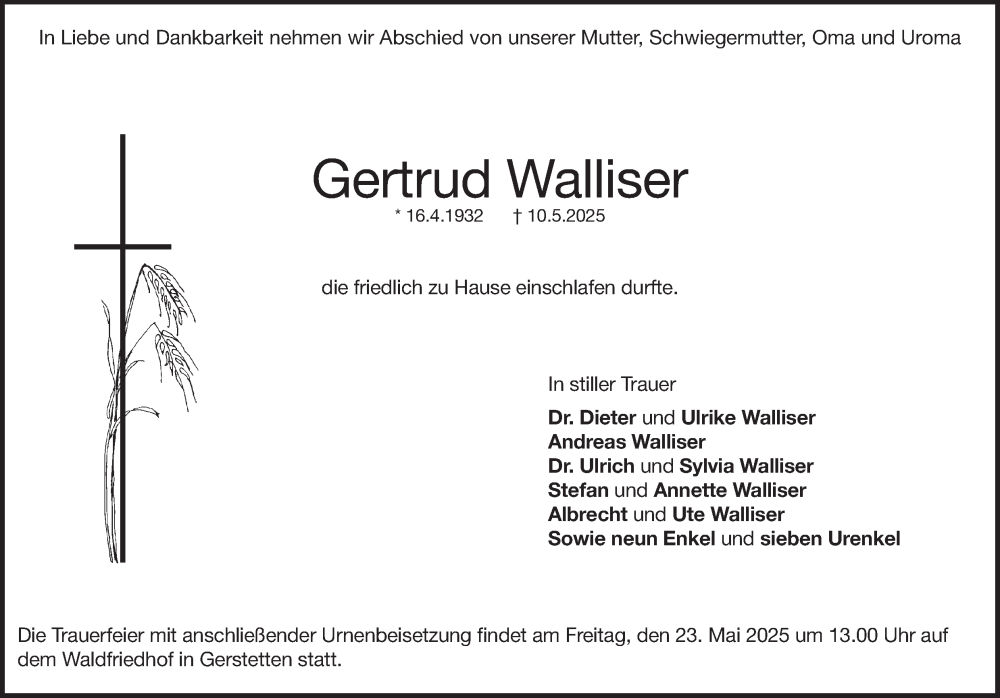Hier finden Sie alle Traueranzeigen aus der Zeitung, die bisher für Gertrud Walliser erschienen sind. Weitere Traueranzeigen, die in der Zeitung erscheinen, werden hier ebenfalls aufgelistet