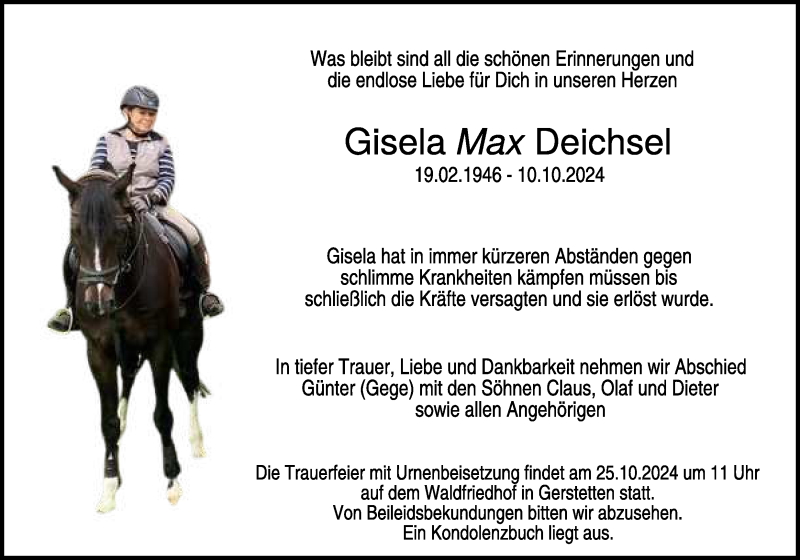 Hier finden Sie alle Traueranzeigen aus der Zeitung, die bisher für Gisela Deichsel erschienen sind. Weitere Traueranzeigen, die in der Zeitung erscheinen, werden hier ebenfalls aufgelistet