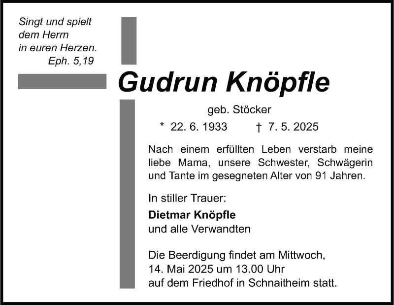 Hier finden Sie alle Traueranzeigen aus der Zeitung, die bisher für Gudrun Knöpfle erschienen sind. Weitere Traueranzeigen, die in der Zeitung erscheinen, werden hier ebenfalls aufgelistet
