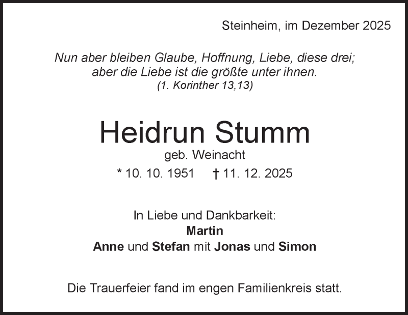 Hier finden Sie alle Traueranzeigen aus der Zeitung, die bisher für Heidrun Stumm erschienen sind. Weitere Traueranzeigen, die in der Zeitung erscheinen, werden hier ebenfalls aufgelistet