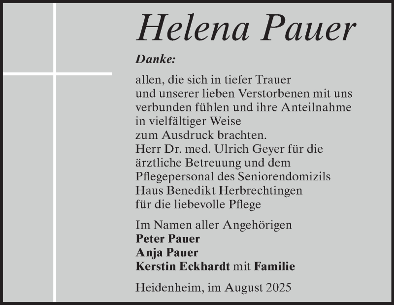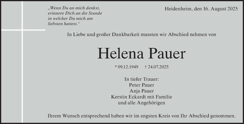 Hier finden Sie alle Traueranzeigen aus der Zeitung, die bisher für Helena Pauer erschienen sind. Weitere Traueranzeigen, die in der Zeitung erscheinen, werden hier ebenfalls aufgelistet