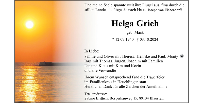 Hier finden Sie alle Traueranzeigen aus der Zeitung, die bisher für Helga Grich erschienen sind. Weitere Traueranzeigen, die in der Zeitung erscheinen, werden hier ebenfalls aufgelistet
