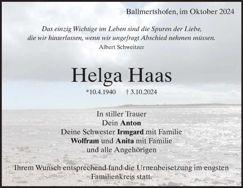 Hier finden Sie alle Traueranzeigen aus der Zeitung, die bisher für Helga Haas erschienen sind. Weitere Traueranzeigen, die in der Zeitung erscheinen, werden hier ebenfalls aufgelistet