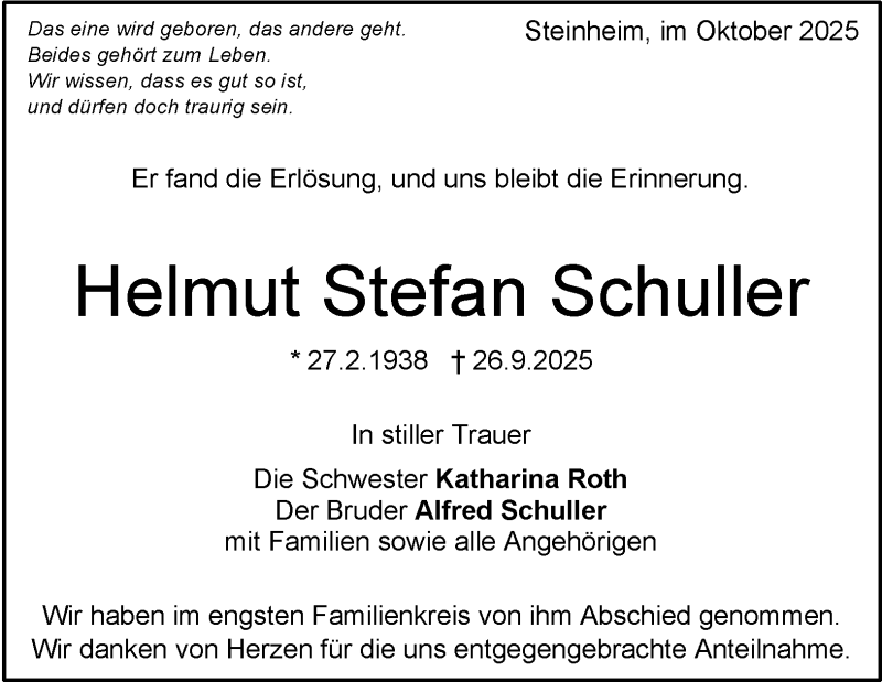 Hier finden Sie alle Traueranzeigen aus der Zeitung, die bisher für Helmut Stefan Schuller erschienen sind. Weitere Traueranzeigen, die in der Zeitung erscheinen, werden hier ebenfalls aufgelistet