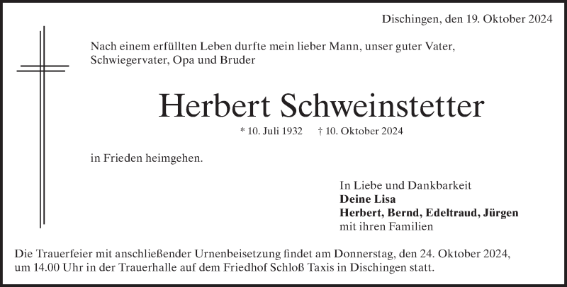 Hier finden Sie alle Traueranzeigen aus der Zeitung, die bisher für Herbert Schweinstetter erschienen sind. Weitere Traueranzeigen, die in der Zeitung erscheinen, werden hier ebenfalls aufgelistet