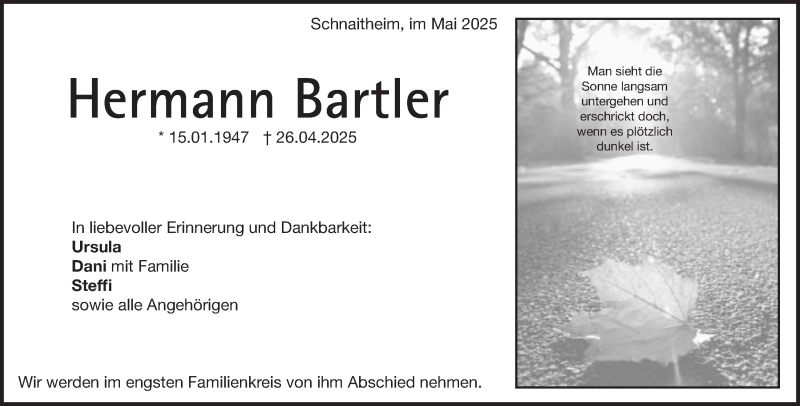 Hier finden Sie alle Traueranzeigen aus der Zeitung, die bisher für Hermann Bartler erschienen sind. Weitere Traueranzeigen, die in der Zeitung erscheinen, werden hier ebenfalls aufgelistet