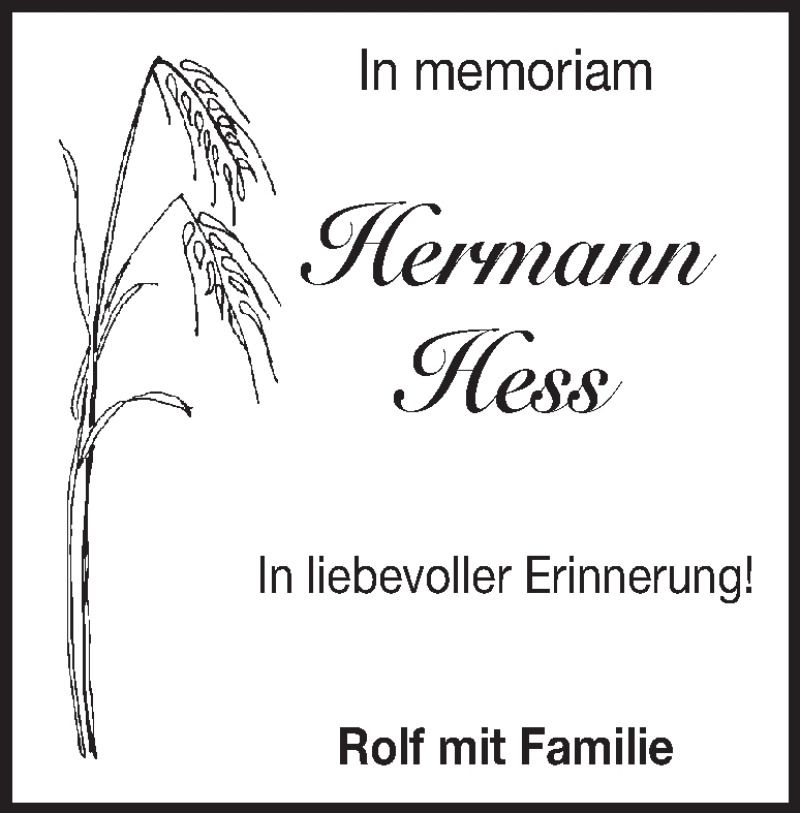 Hier finden Sie alle Traueranzeigen aus der Zeitung, die bisher für Hermann Heß erschienen sind. Weitere Traueranzeigen, die in der Zeitung erscheinen, werden hier ebenfalls aufgelistet