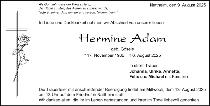 Hier finden Sie alle Traueranzeigen aus der Zeitung, die bisher für Hermine Adam erschienen sind. Weitere Traueranzeigen, die in der Zeitung erscheinen, werden hier ebenfalls aufgelistet